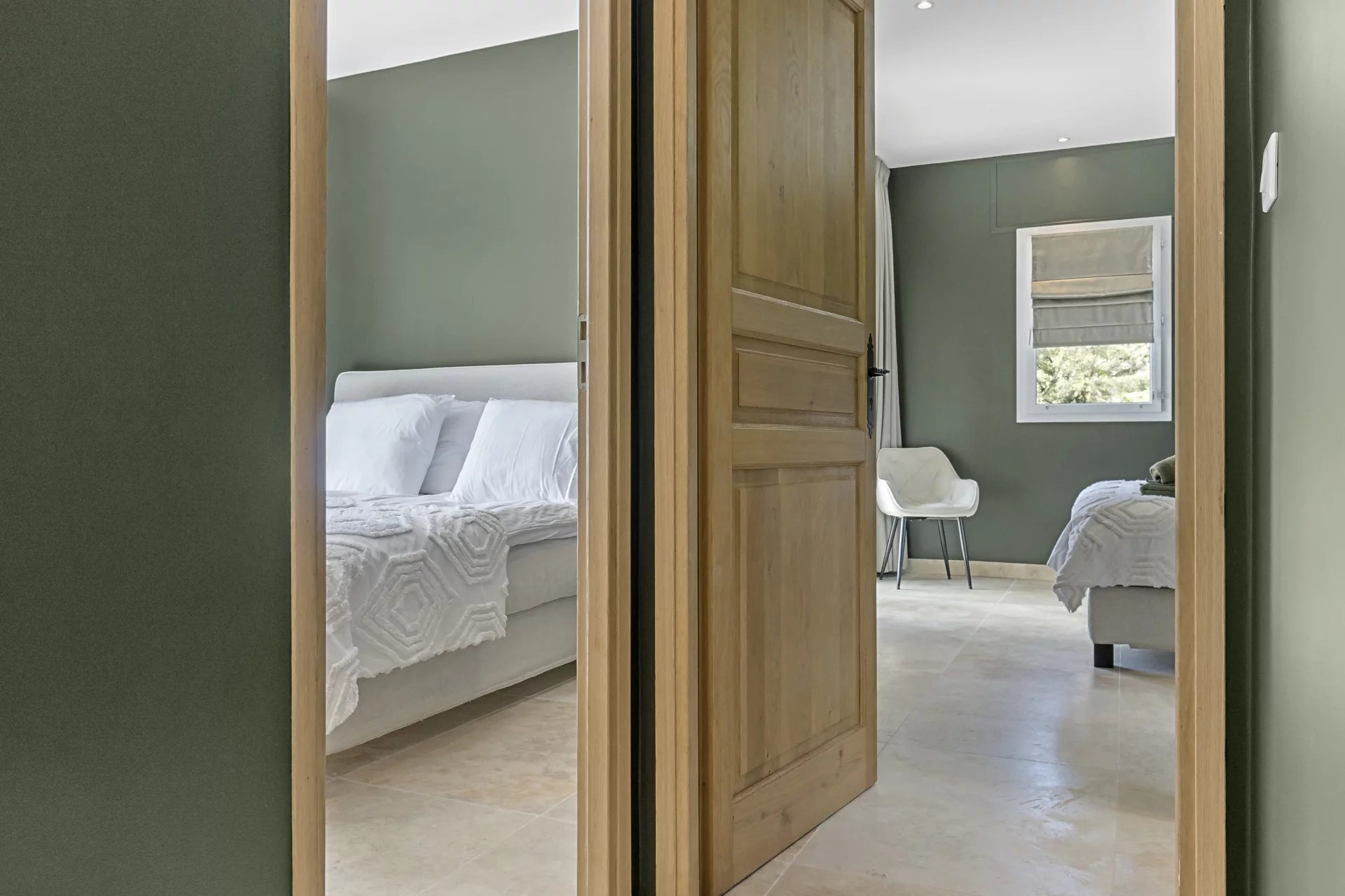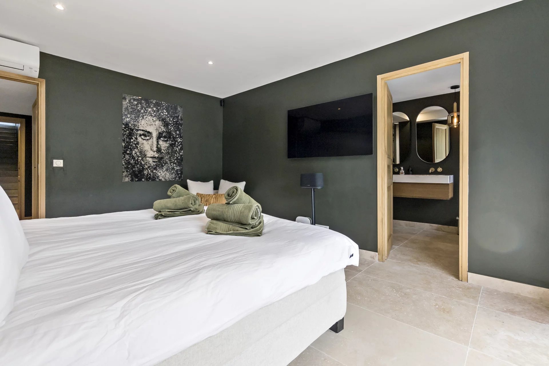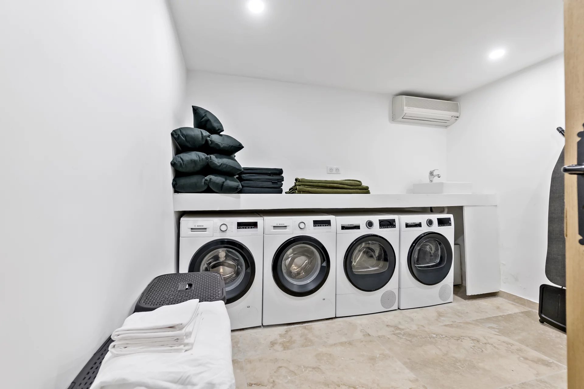 Die moderne und sehr luxuriöse Küche ist komplett ausgestattet, einschließlich Herd, Geschirrspüler, Kombi-Mikrowelle, Kombi-Dampfgarer, zwei Kühl-Gefrierkombinationen und einem großen Weinkühler. Im Erdgeschoss befindet sich ein praktischer Raum mit einer Doppelwaschmaschine und einem Wäschetrockner. Die Villa verfügt über sechs großzügige Schlafzimmer, jedes mit eigenem Badezimmer mit Toilette und Dusche sowie Klimaanlage. Die Schlafzimmer bieten höchsten Komfort mit luxuriösen Boxspringbetten und modernen Badezimmern. Das Schlafzimmer im ersten Stock dient als Master-Suite mit einem geräumigen Doppelbett und einem luxuriösen Badezimmer mit Badewanne, begehbarer Doppeldusche, Doppelwaschbecken und Toilette. Die zweite Master-Suite hat die gleiche Einrichtung und befindet sich auf der unteren Ebene der Villa. Die anderen Schlafzimmer, sowohl in der Villa als auch im unabhängigen Gästehaus, bieten die gleiche hochwertige Ausstattung und gewährleisten Privatsphäre und Komfort für alle Mitglieder der Gruppe.