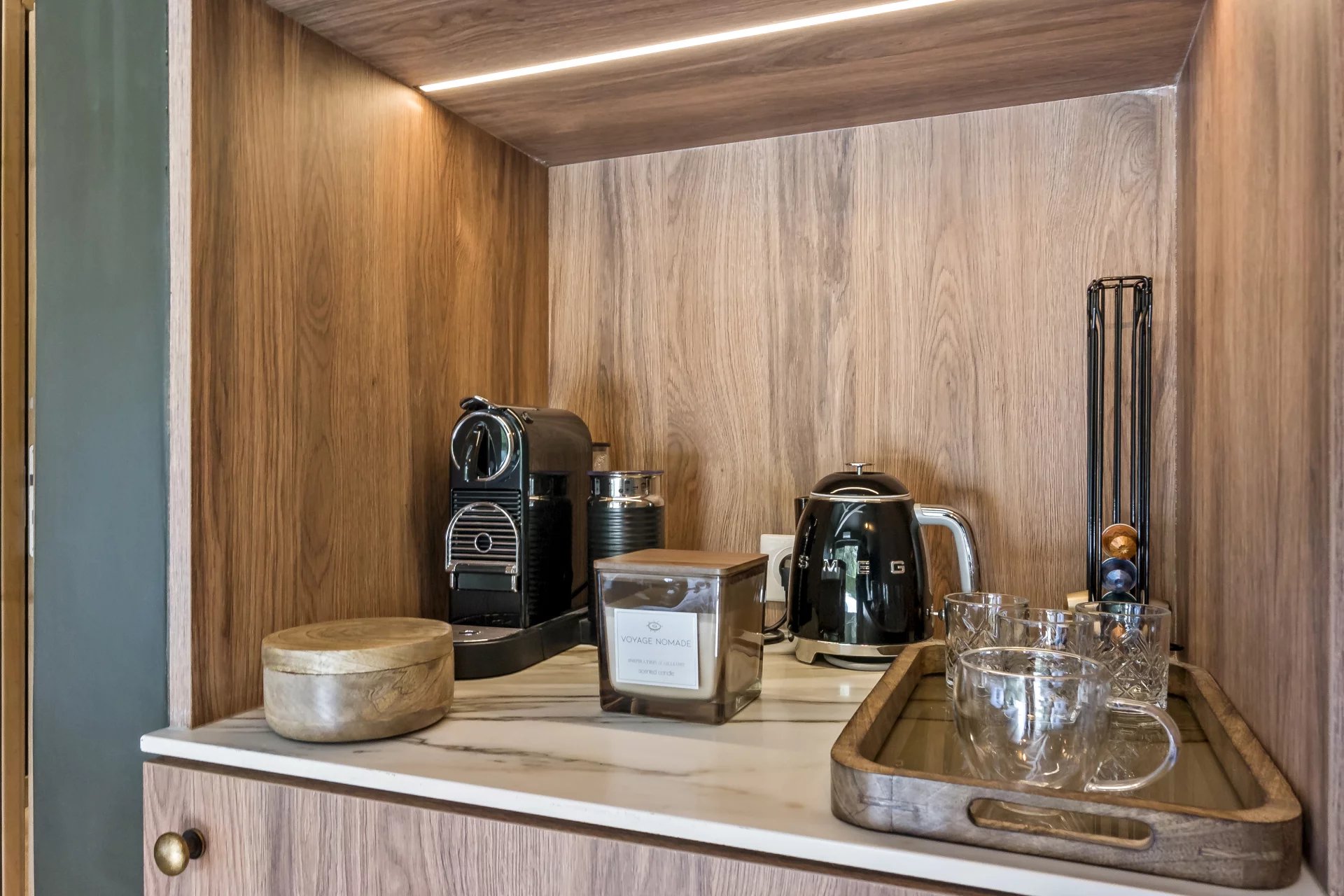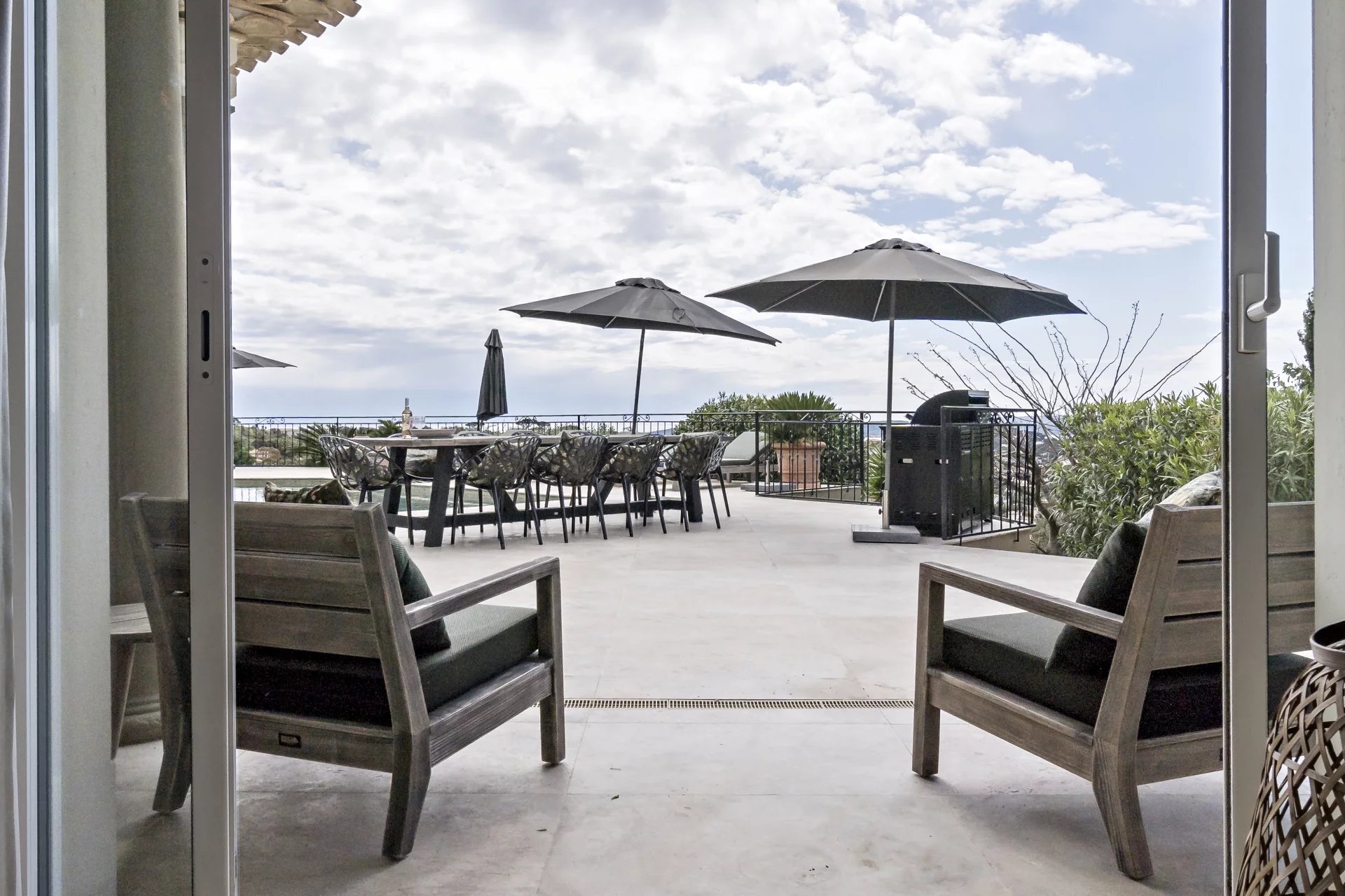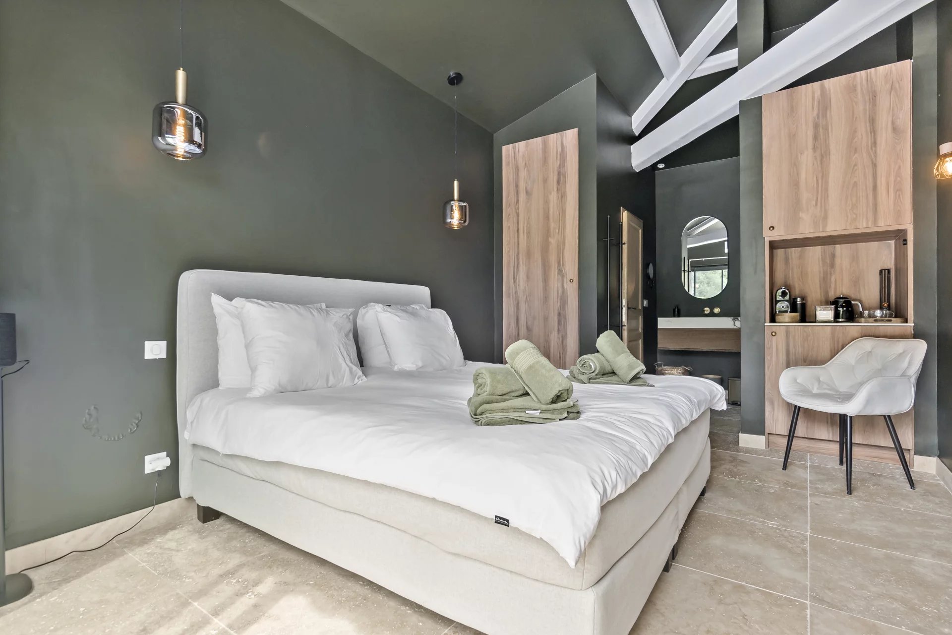 Die moderne und sehr luxuriöse Küche ist komplett ausgestattet, einschließlich Herd, Geschirrspüler, Kombi-Mikrowelle, Kombi-Dampfgarer, zwei Kühl-Gefrierkombinationen und einem großen Weinkühler. Im Erdgeschoss befindet sich ein praktischer Raum mit einer Doppelwaschmaschine und einem Wäschetrockner. Die Villa verfügt über sechs großzügige Schlafzimmer, jedes mit eigenem Badezimmer mit Toilette und Dusche sowie Klimaanlage. Die Schlafzimmer bieten höchsten Komfort mit luxuriösen Boxspringbetten und modernen Badezimmern. Das Schlafzimmer im ersten Stock dient als Master-Suite mit einem geräumigen Doppelbett und einem luxuriösen Badezimmer mit Badewanne, begehbarer Doppeldusche, Doppelwaschbecken und Toilette. Die zweite Master-Suite hat die gleiche Einrichtung und befindet sich auf der unteren Ebene der Villa. Die anderen Schlafzimmer, sowohl in der Villa als auch im unabhängigen Gästehaus, bieten die gleiche hochwertige Ausstattung und gewährleisten Privatsphäre und Komfort für alle Mitglieder der Gruppe.