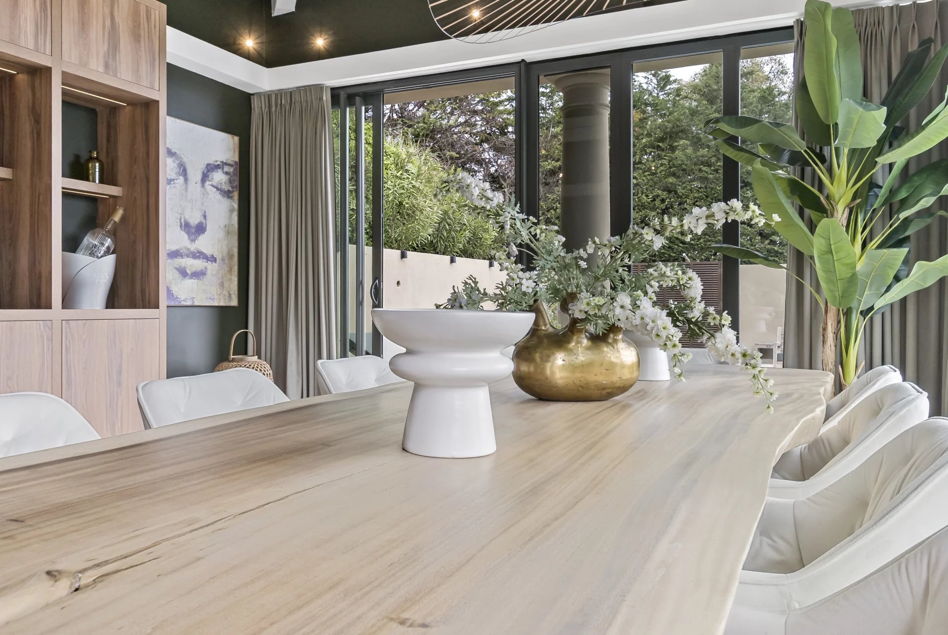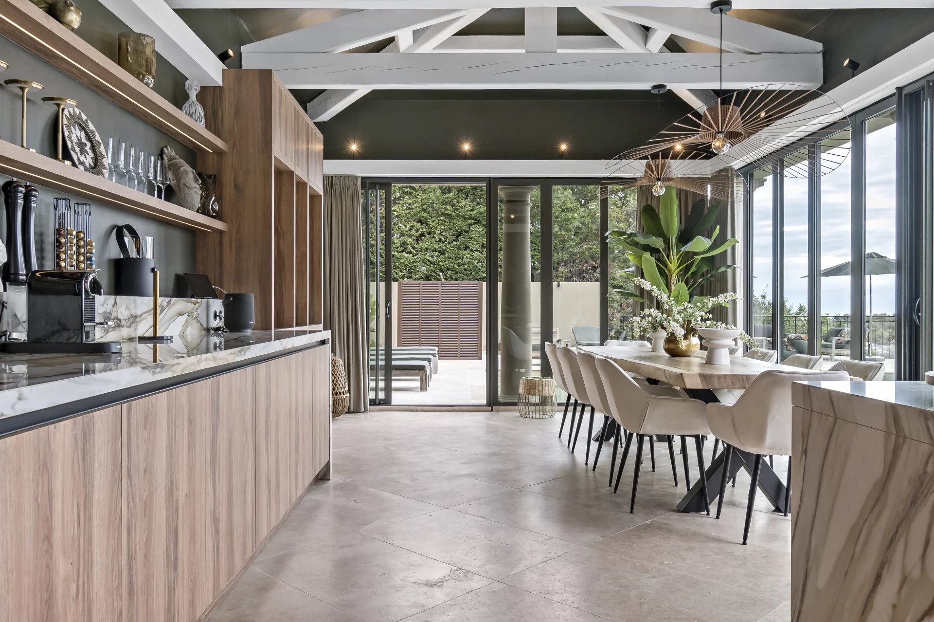 Mit einer großzügigen Wohnfläche von 340 m² bietet diese Villa nicht nur Platz, sondern auch Raffinesse und Komfort. Das helle und offene Wohnzimmer ist geschmackvoll eingerichtet und mit bequemen Sitzgelegenheiten ausgestattet. Das Wohnzimmer geht nahtlos in die geräumige offene Küche über, wo ein großer Esstisch zu langen, geselligen Abendessen einlädt. Vom Wohnzimmer und der Küche aus haben Sie über große Schiebetüren direkten Zugang zur sonnigen Terrasse. Es gibt auch eine schöne Terrasse auf der Bergseite der Villa.
