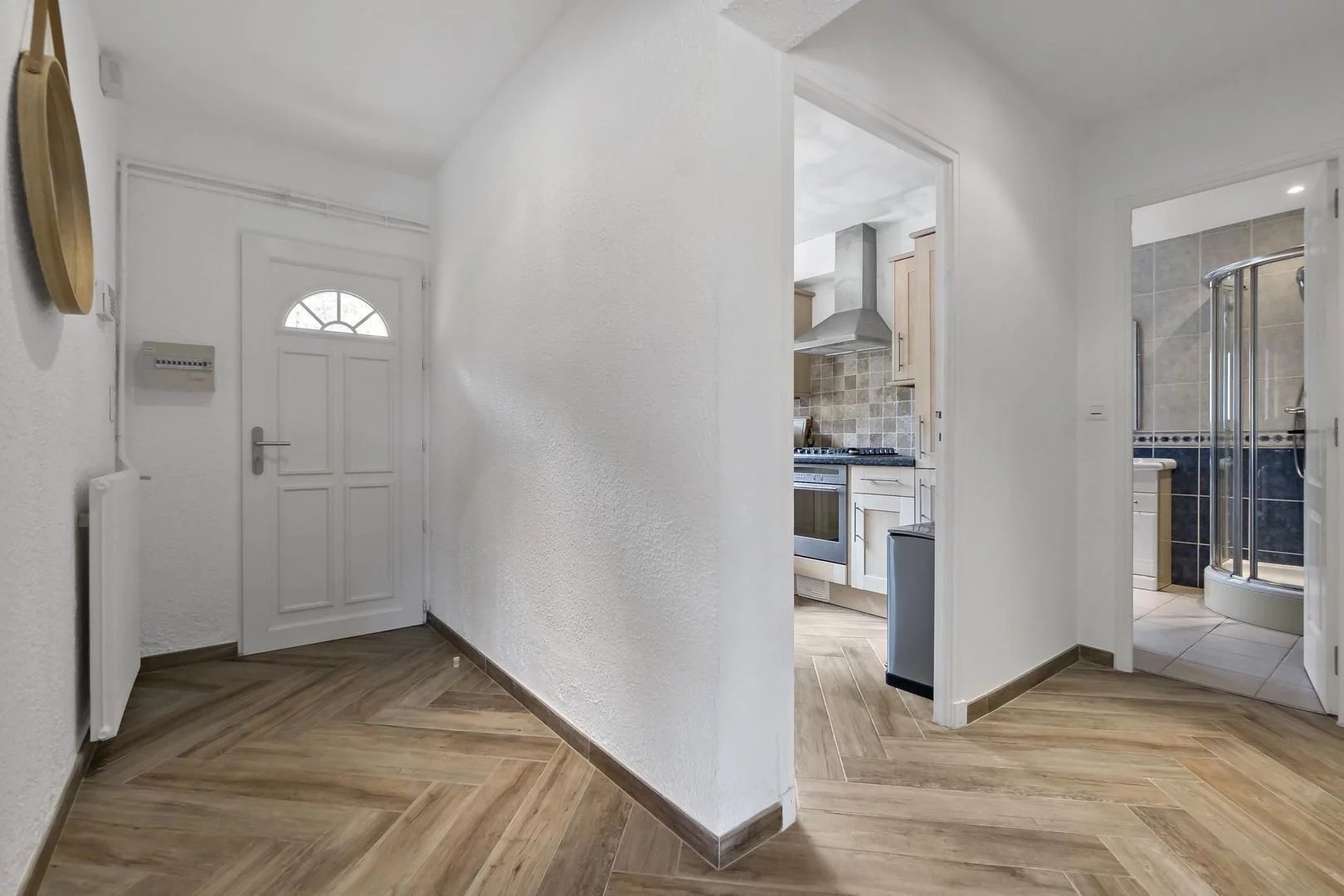 Wohnung 2: Eingang; gemütliches Wohnzimmer und eine gut ausgestattete Küche; Schlafzimmer und Badezimmer.