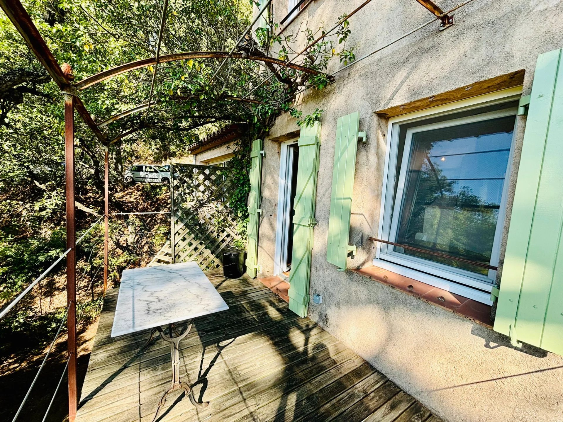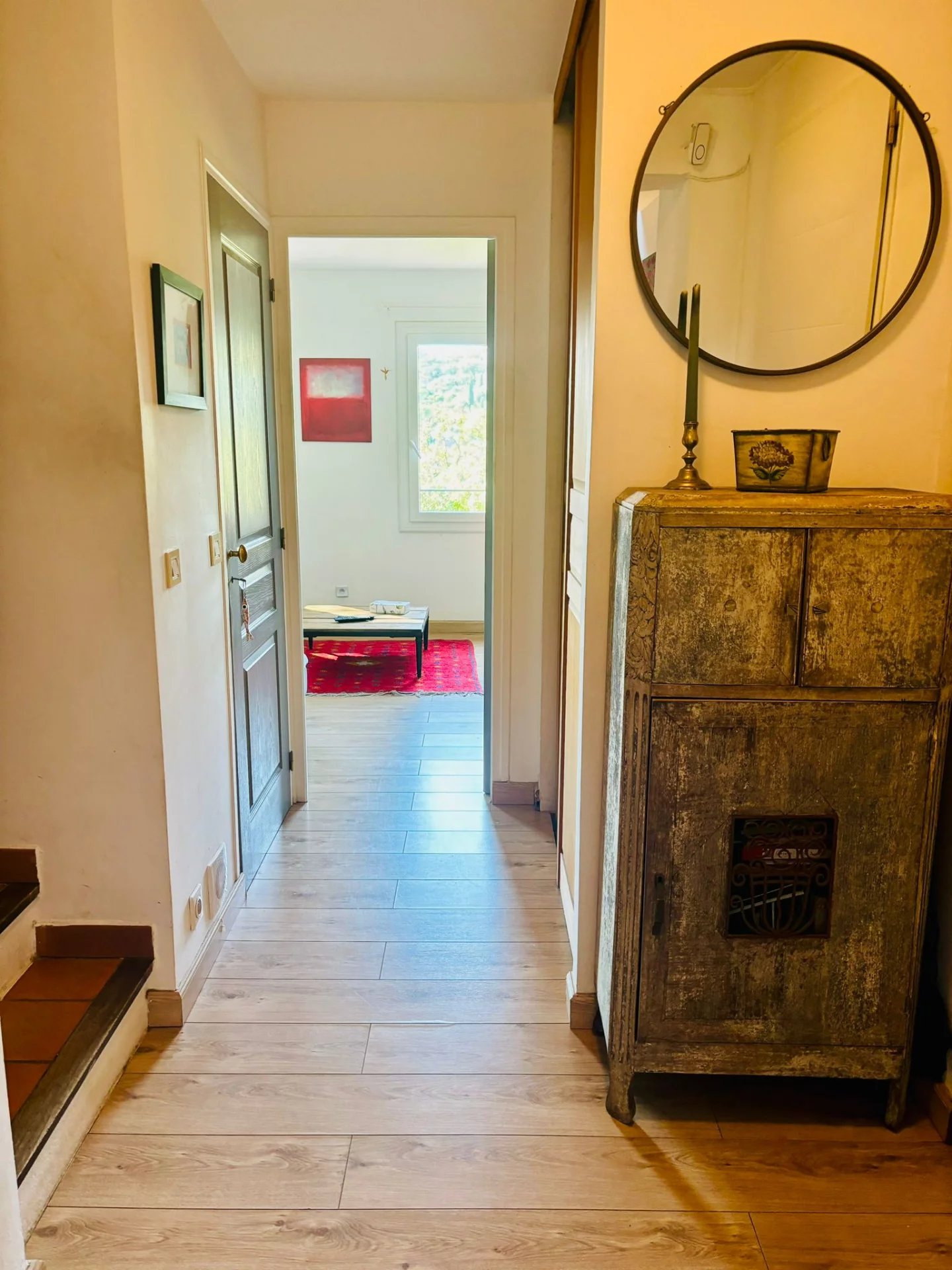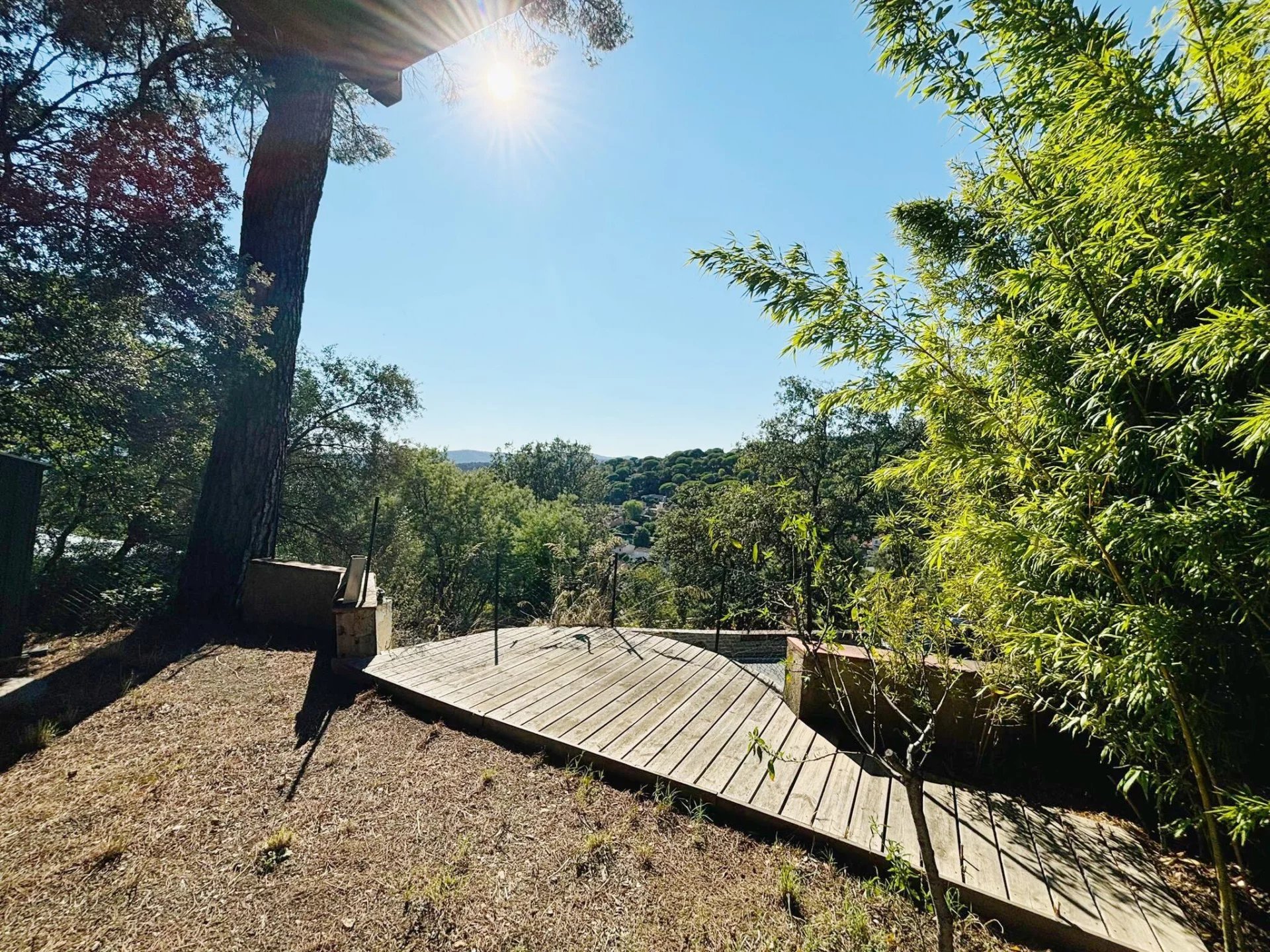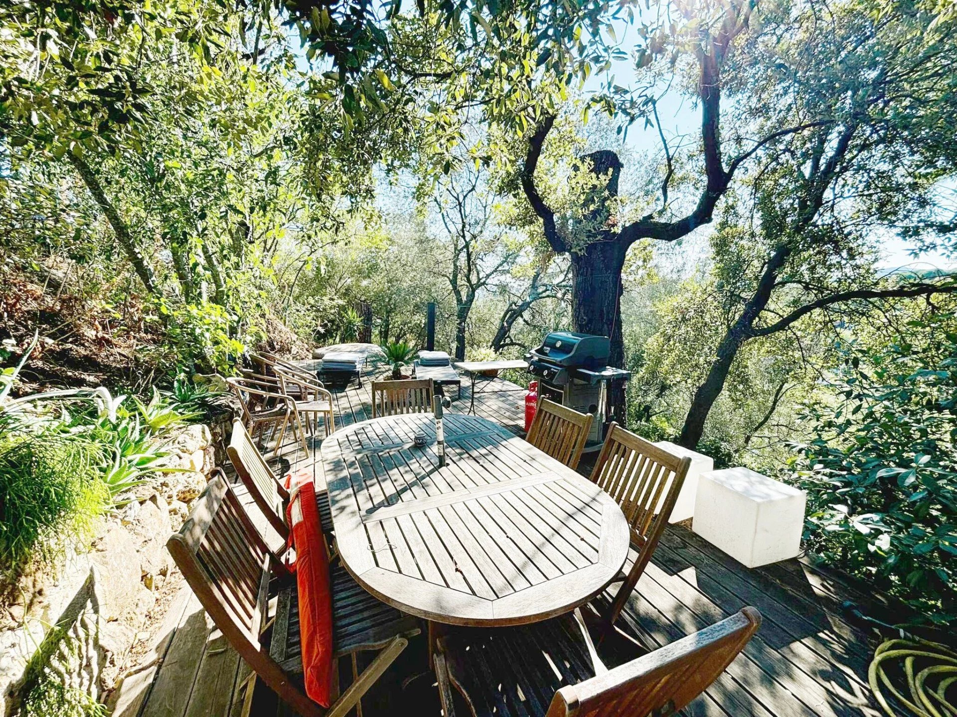 Cette maison a Grimaud est facilement accessible et offre de belles vues. L'orientation est sud. La maison comprend deux unités de vie séparées. Chaque unité de vie a sa propre terrasse. Au rez-de-chaussée, vous trouverez une cuisine avec salle à manger et accès à une terrasse spacieuse, un salon, des toilettes et une salle d'eau.