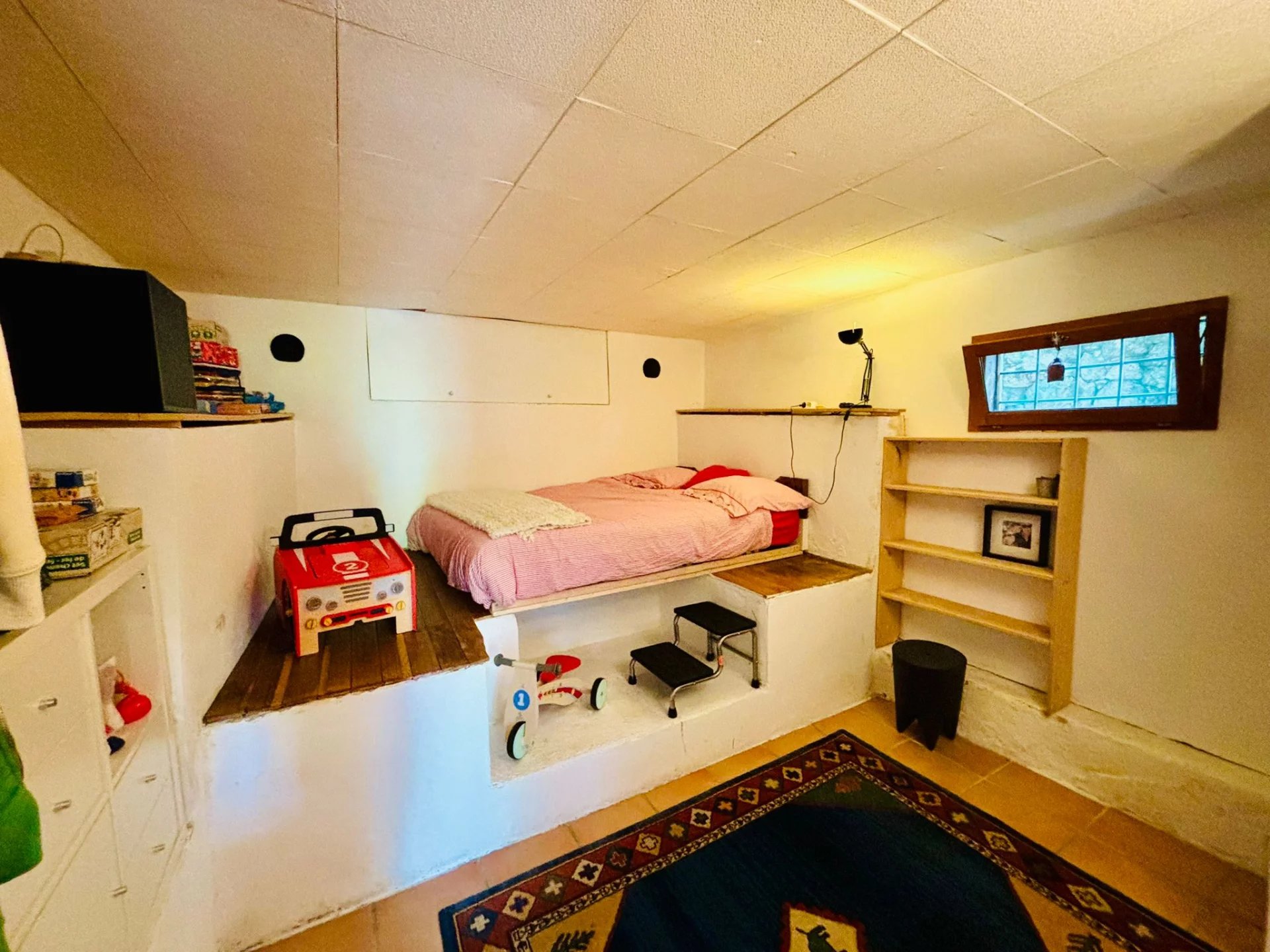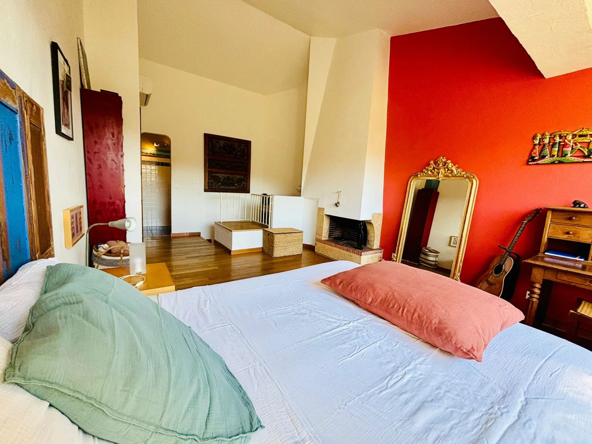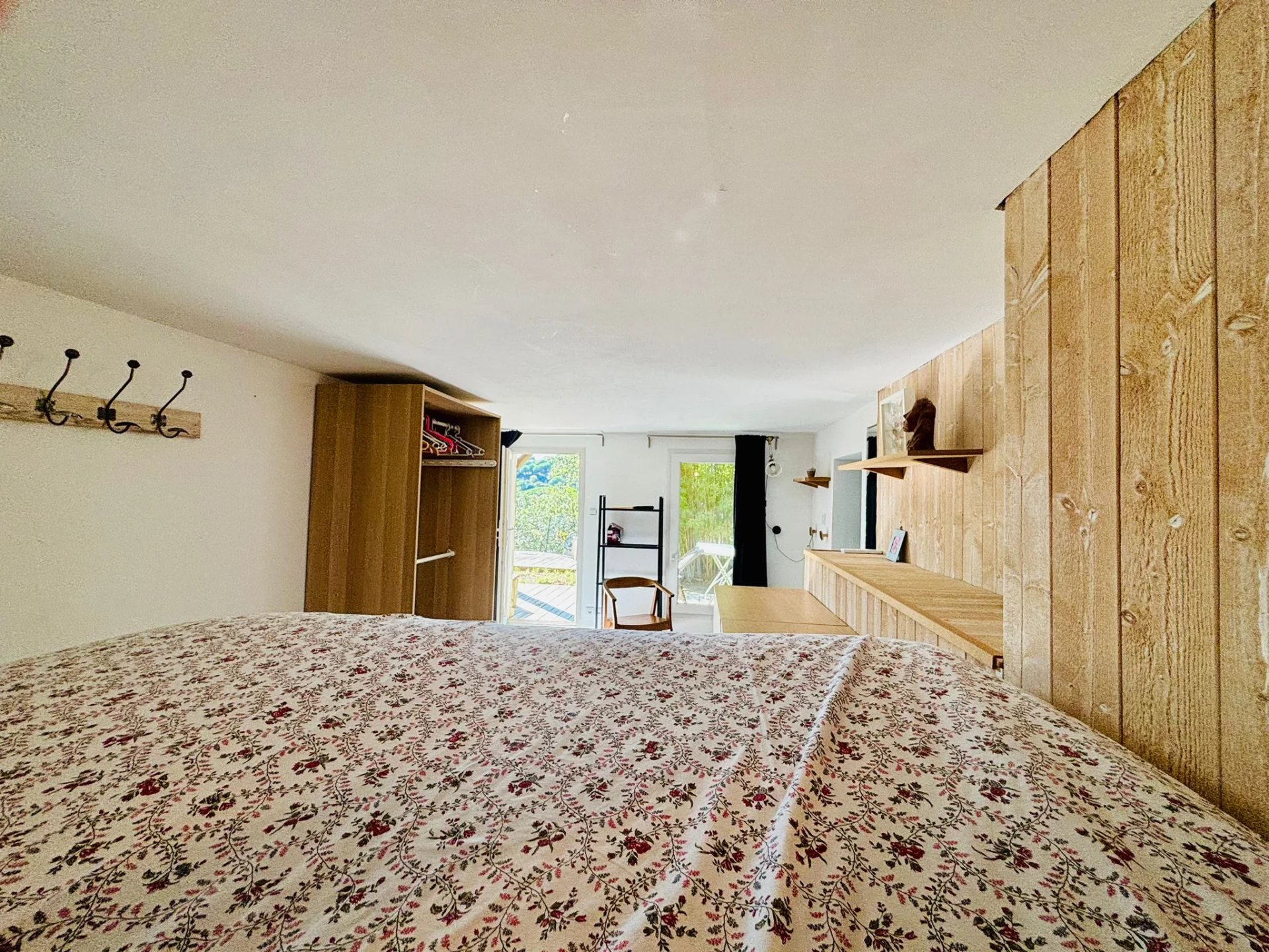 À l'étage, vous trouverez une chambre spacieuse avec cheminée, de nombreux placards et une salle de douche. De là, vous bénéficiez d'une vue panoramique.