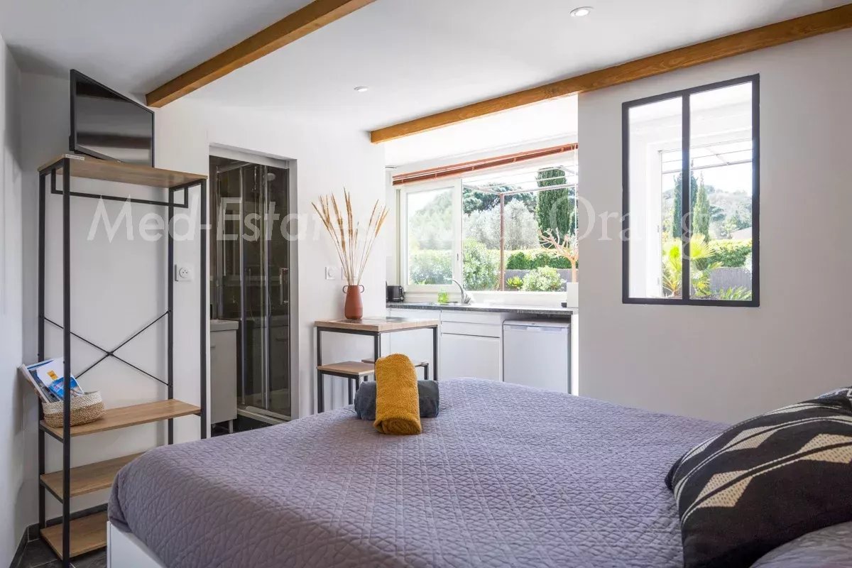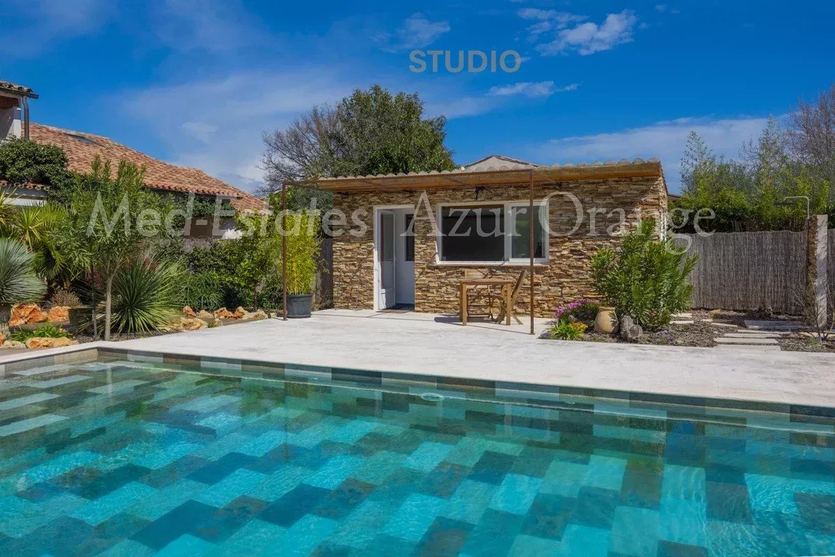 La piscine est de 13.5x5m. Pool house/studio (17m²) avec une kitchenette et une salle d'eau.