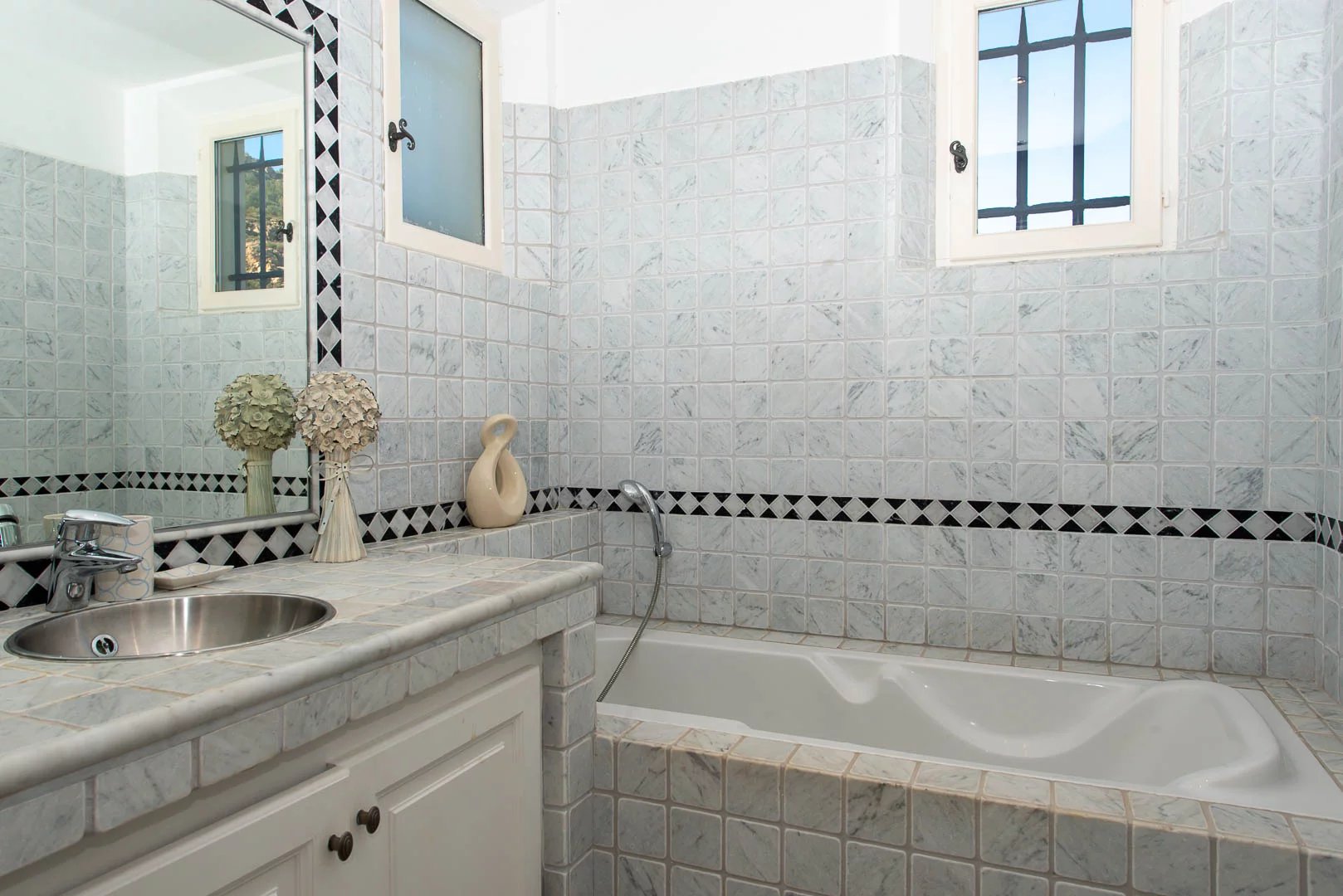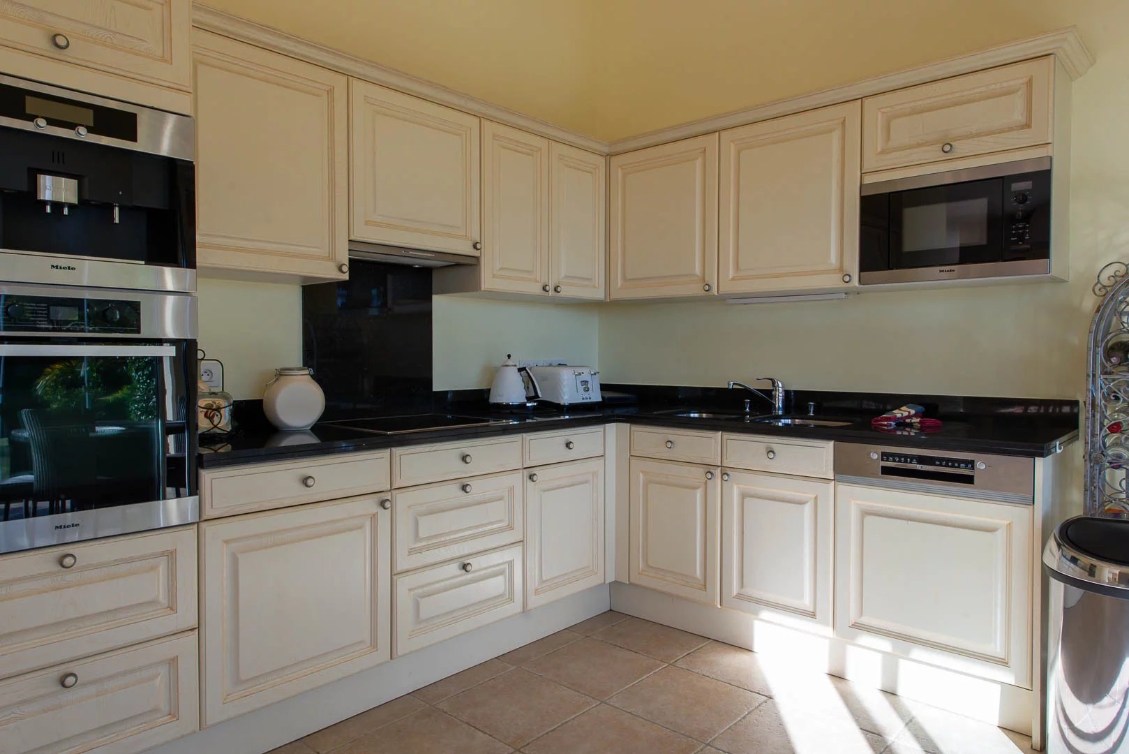 Entree; gastentoilet; grote zonnige woon- en eetkamer; halfopen keuken; van hieruit heb je toegang tot de aangelegde tuin; slaapkamer met en-suite badkamer.Eerste verdieping: master bedroom met en-suite badkamer; 2 aangrenzende slaapkamers. Ook hier geniet je van een adembenemend panoramisch uitzicht op zee! De buitenruimte Ruim terrein met verwarmd zwembad en verschillende overdekte terrassen; buitenkeuken. Zeer ruime garage (2 auto's) en een technische/opslagruimte. Parkeerplaats voor 2 auto's op het terrein.